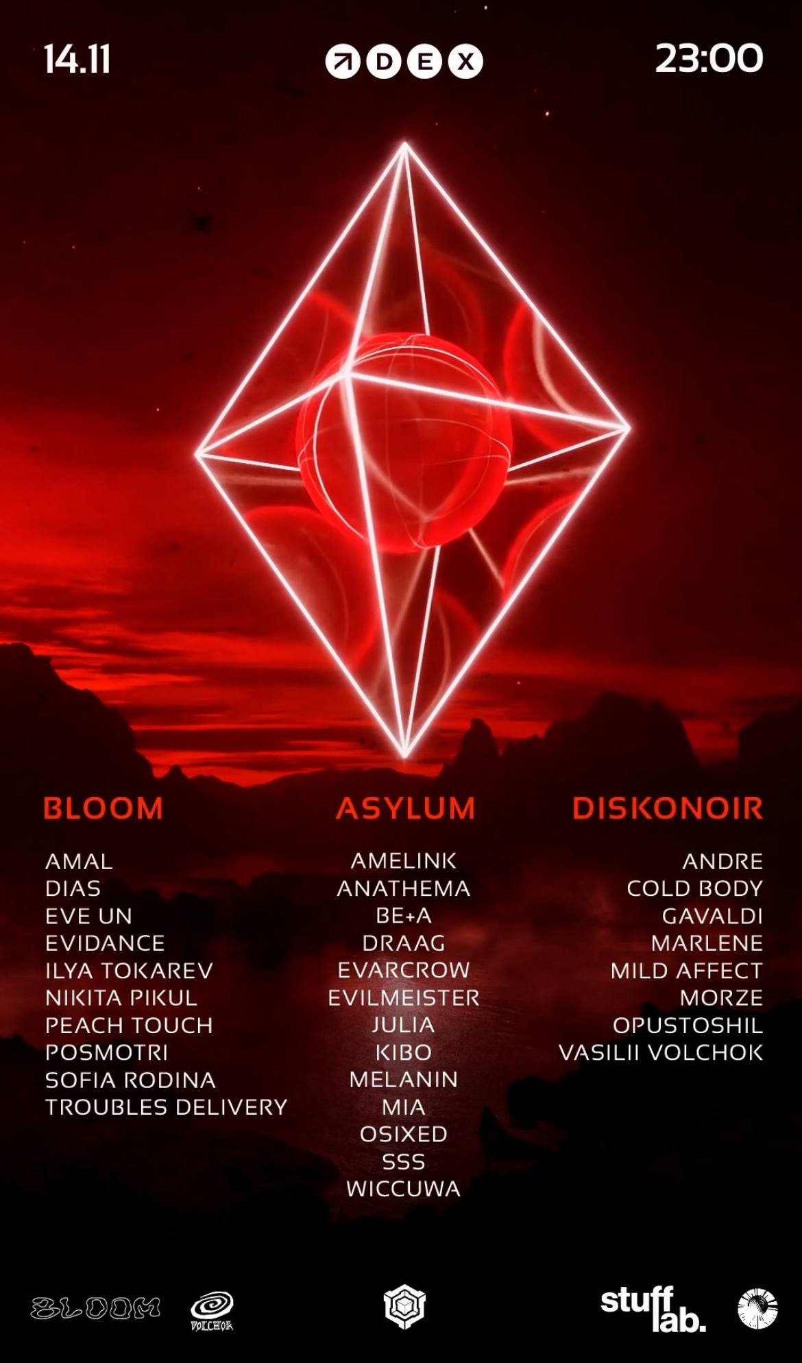 Мощная мультижанровая коллаборация хард-технового Asylum, а также наших вечеринок Bloom и DiskoNoir на трёх танцполах Декса, корнеры представят Stuff Lab. и Volchok.