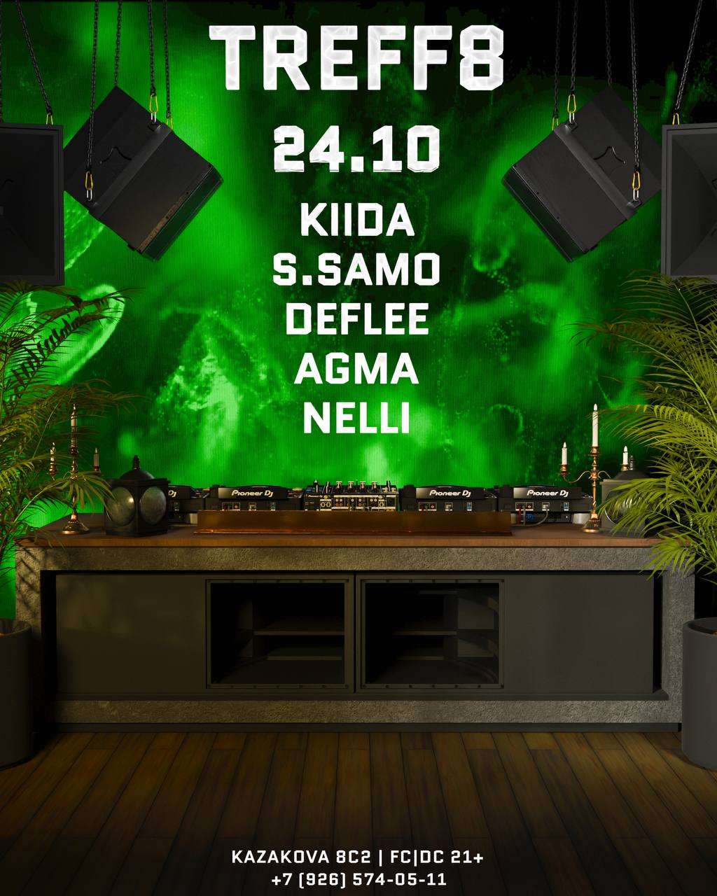 В TREFF8 мы продолжаем создавать вечера, где звук становится живым, а музыка — проводником эмоций. В этот вечер за пультом KIIDA, S.SAMO, DEFLEE, AGMA и NELLI — артисты, чьи сеты превращают танцпол в пространство движения и настроения, где каждая нота ощущается сердцем.