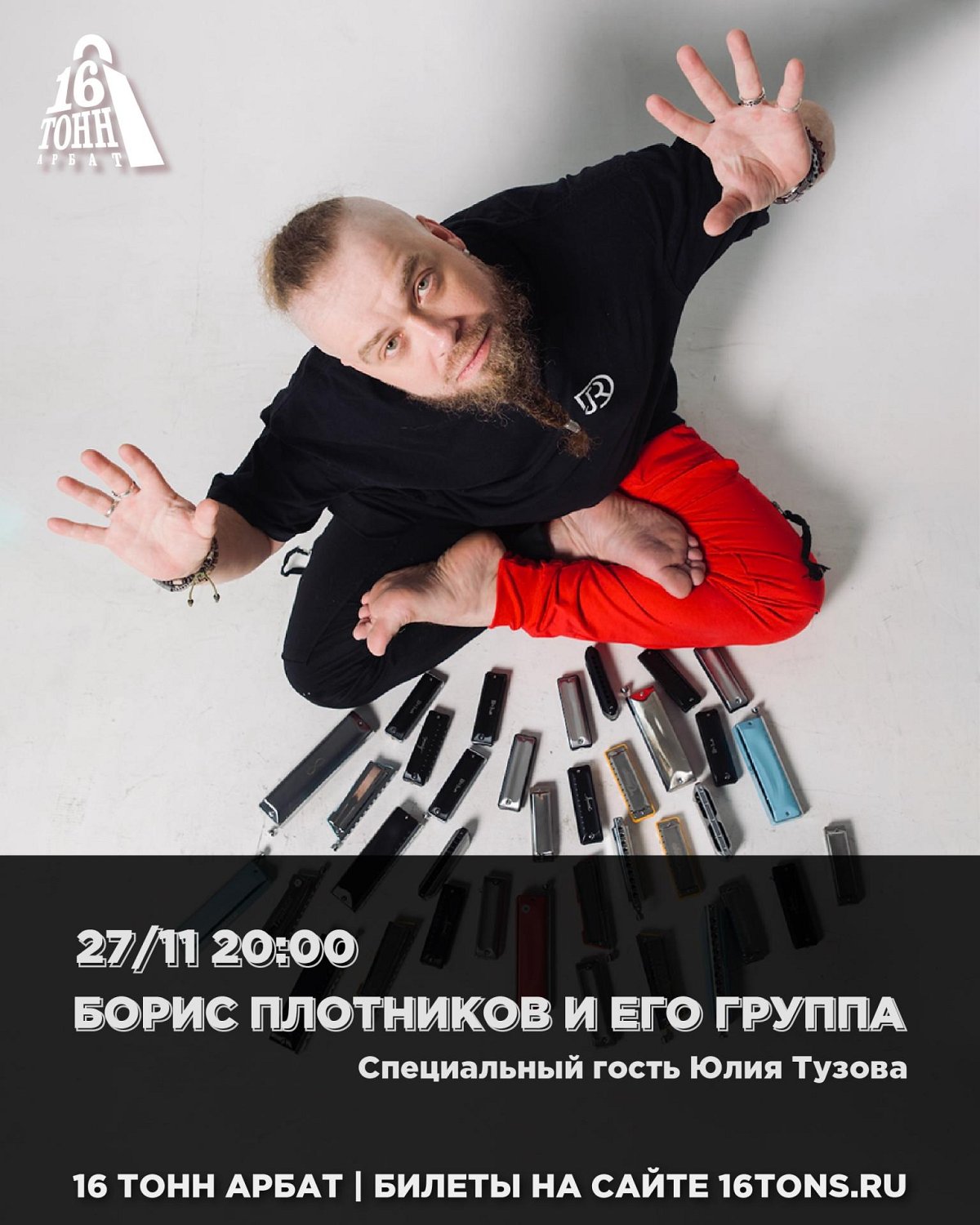 Борис Плотников — виртуозный исполнитель на губной гармонике, член коллективов Евгения Маргулиса и Михаила Башакова, приглашает на свой осенний концерт. Авторские пьесы, русские народные песни в оригинальном исполнении а так же хиты русской и мировой музыки — все это ждет гостей в вечер четверга в уютном зале в самом центре Москвы. Специальный гость — Юлия Тузова, уникальный автор и исполнитель, известная своими работами с группами Ключевая, Калинов Мост, Кириллом "Децл" Толмацким и многими другими. Специальный гость - Юлия Тузова.
