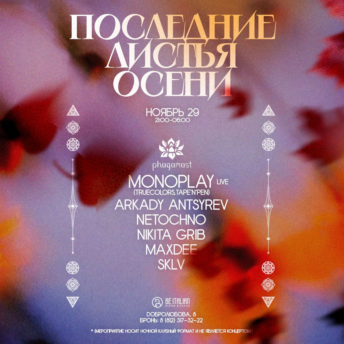 Когда осень склоняется к завершению и холод встречается с первым дыханием зимы — мы собираемся вместе. 29 ноября Phagamast соберёт своих друзей и слушателей на заключительном шоукейсе сезона.