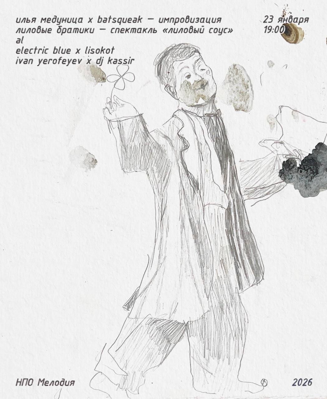 Январь 23, пятница. Очень особенное мероприятие, хотя бы тем, что мы с прошлого года не делали чего-то такого, где в начале спектакль «Лиловый соус» от Лиловые Братики, Sahaa feat. Yerofeyev, потом диджей Kassir, следом импровизация от Batsqueak & Илья Медуница и даже 2-х часовой сет Electric Blue b2b Lisokot. Напоследок Al.