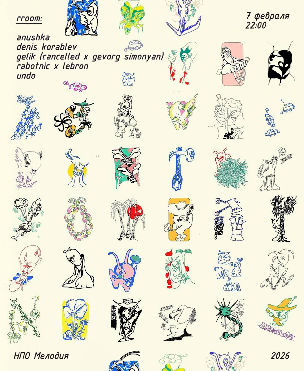 Февраль 7, суббота. Откроют Rabotnic & Lebron. Полночь – леди Anushka. В прайм Denis Korablev, следом врывается Gelik – коллаб Сancelled & Gevorg Simonyan. Утренний Undo…