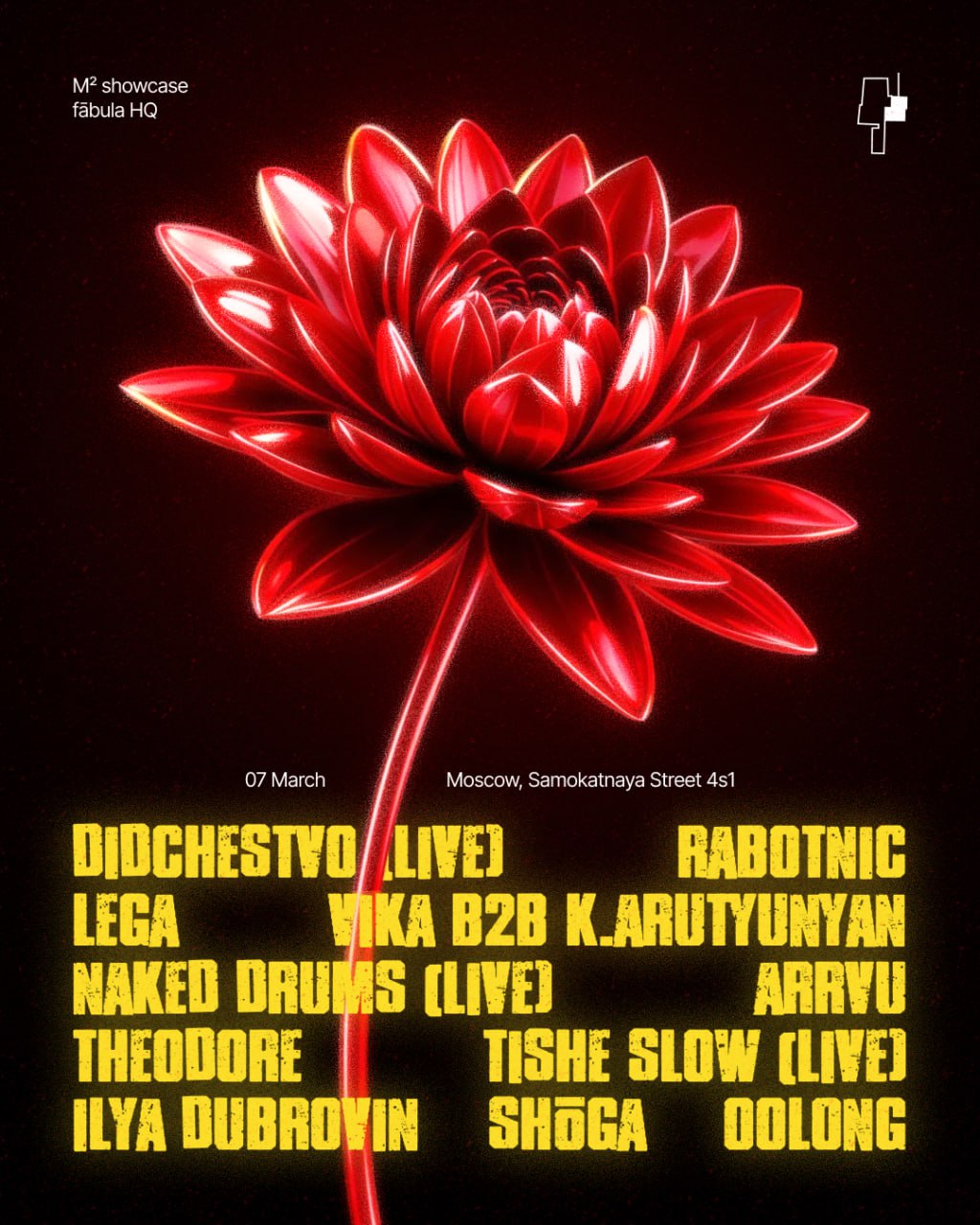 В первую субботу весны, мы собираемся что бы нарушить тихие вернисажи и благоговейное молчание fābula HQ. Событие растянется на всю ночь, где мы шагнём за грань привычного, создавая оммаж клубу в новом пространстве. Грань между реальностью и иллюзией тает сквозь звуковое повествование от резидентов и друзей, подкрепляя это перформативно-инсталляционной частью