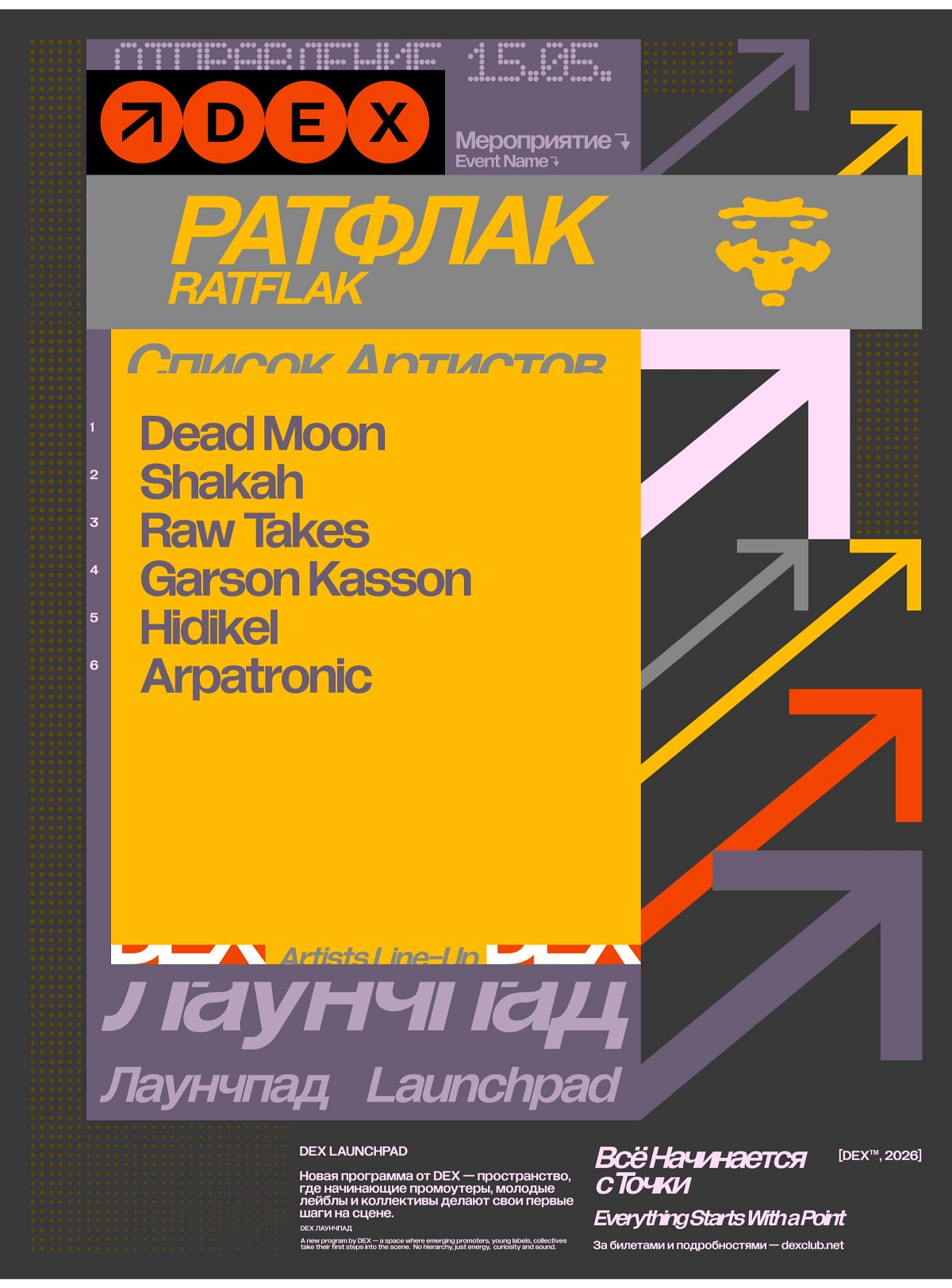 DEX Launchpad — серия клуба, где молодым промоутерам и независимым коллективам предоставляется площадка для проявления. Точка входа и пространство для новых форматов и разных способов слышать танцпол.