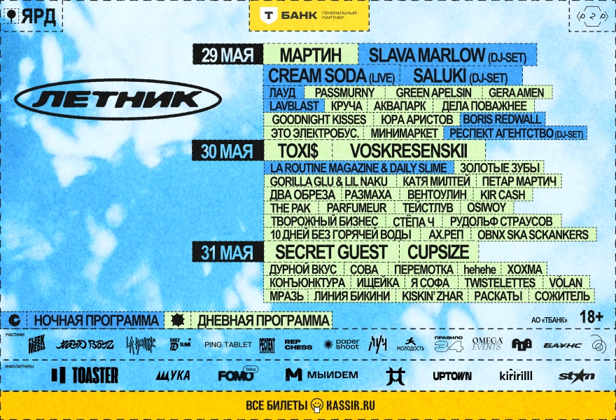 ЛЕТНИК — мультиформатный музыкальный фестиваль от команды p2p. В 2026 году он состоится уже во второй раз и традиционно откроет сезон с 29 по 31 мая. Нас ожидают 6 мультижанровых сцен, насыщенная интерактивная программа и многое другое на новой площадке "ЯРД" в Москве на Белорусской.